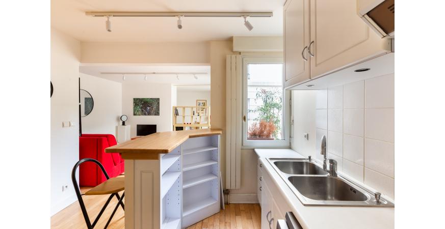 Located rue du Perche, in the heart of the old Marais, Paris 3rd, a 45m² (452 sq ft) apartment located on the ground floor in a secure courtyard of a well-maintained old building.