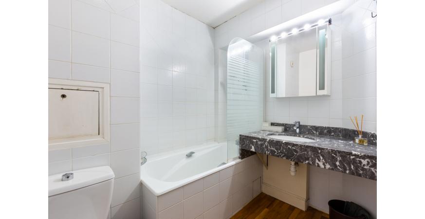 The apartment is refurbished. It offers a living room with a sofa bed, an open fitted kitchen (washing machine/dryer, dishwasher), a bedroom (semi-separate) with wardrobe and a bathroom with toilet.