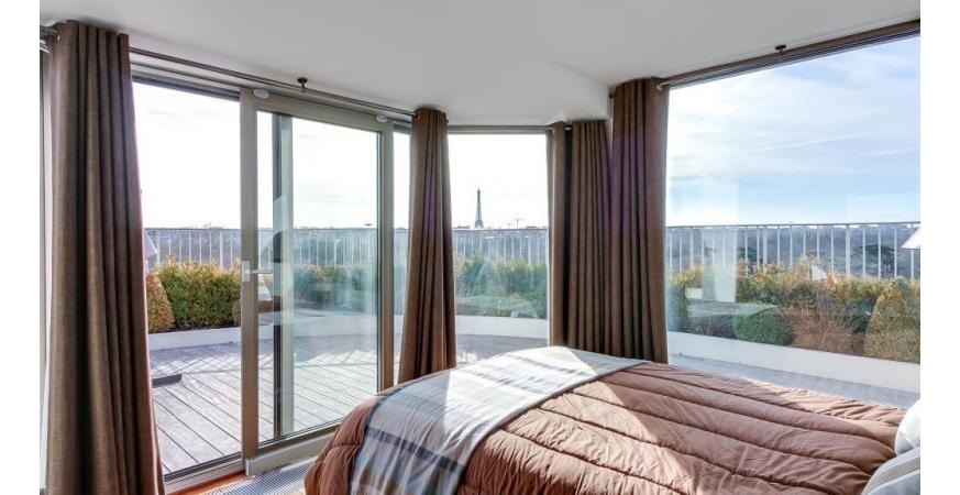 Au 7me étage : une Master suite (63m2, salon, chambre, salle de bain, un dressing) avec l’accès directe sur une terrasse panoramique sur tout Paris de 158m2